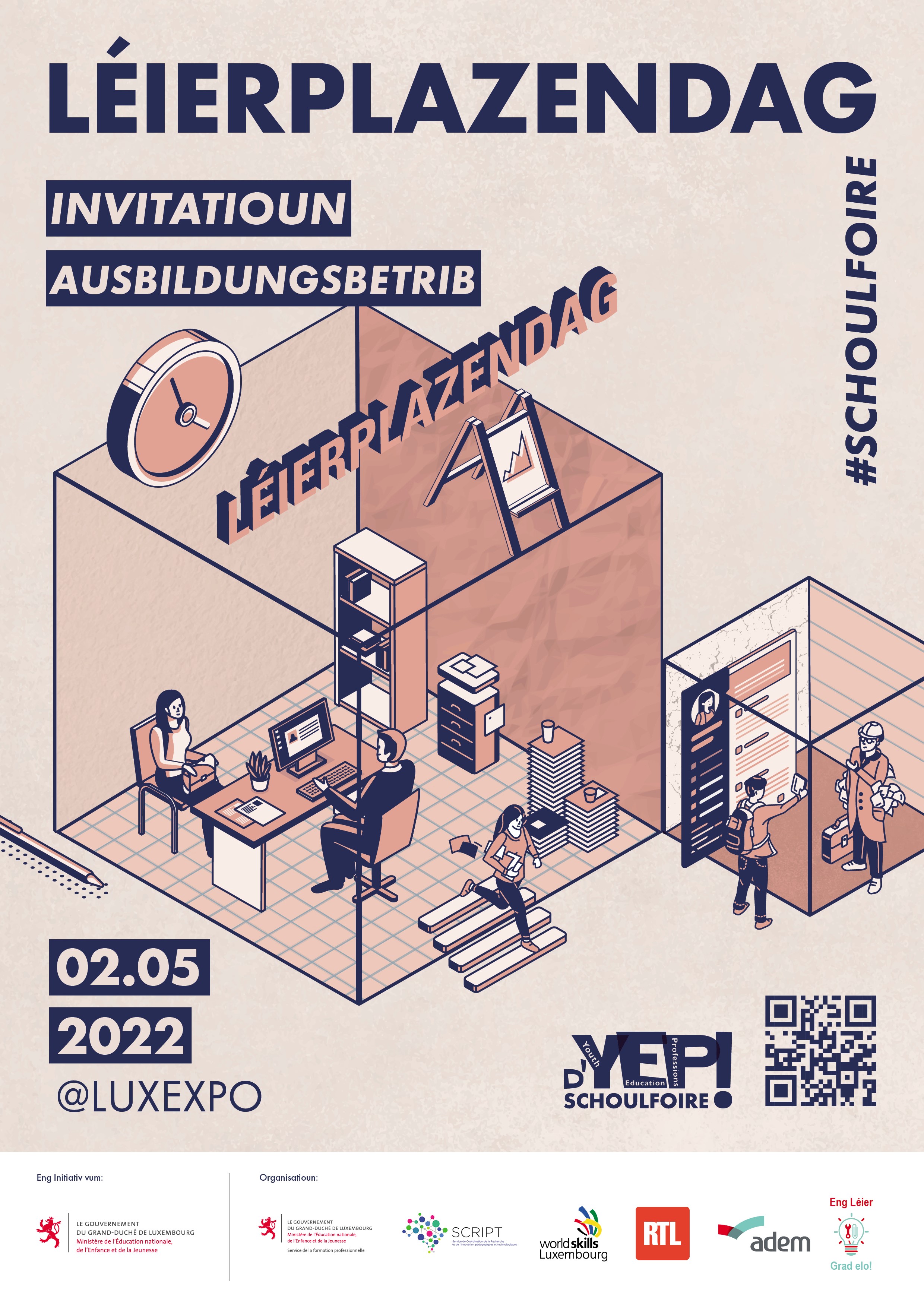 L’ADEM a le plaisir d’ inviter les entreprises au Léierplazendag du 2 mai 2022 qui aura lieu toute la journée à LUXEXPO. Le Léierplazendag fait intégralement partie du grand événement « Schoulfoire » organisé par le Ministère de l’Education nationale, de l'Enfance et de la Jeunesse qui se déroulera sur trois jours et réunira plus de 15.000 personnes en tout.